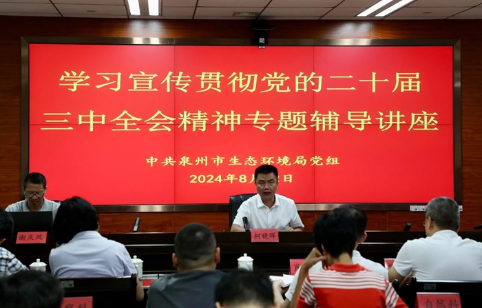 党组举办学习贯彻党的二十届三中全会精神专题辅导讲座,邀请市委宣传部部务会会议成员、市委讲师团团长谢庆凤为全市生态环境系统干部作学习辅导讲座,局党组书记、局长柯晓晖主持并作强调讲话。