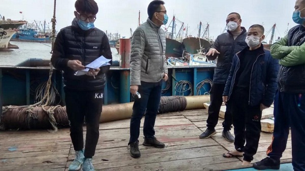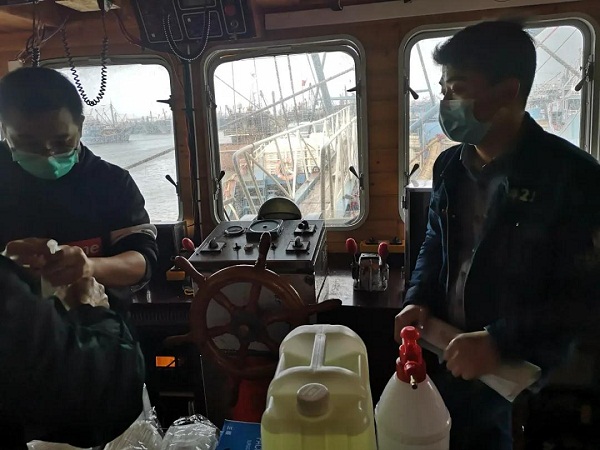 今年的深沪镇拖网渔船首航仪式已经过去几天了,有些提前做好准备的渔船主开始了新一年的征程,但刚满足复工条件的渔船仍在申请出海作业。疫情耽误了渔民们出海的日子,但经济恢复和疫情防控同样是民生重点。面对渔船主人迫切的申请,南春社区居委会不敢怠慢,负责渔业事务的社区干部曾燕权和驻村队员魏长希来到了深沪渔港的码头,在核实渔船的防疫物资和船员健康情况的同时,他们还带来了村民捐赠给渔船的防疫物资。