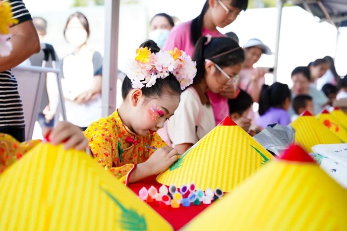 现场参与者以斗笠为画布,用植物颜料绘制碧海鱼跃等海洋主题纹样。(泉州晚报社融媒体记者彭燕珍 摄)
